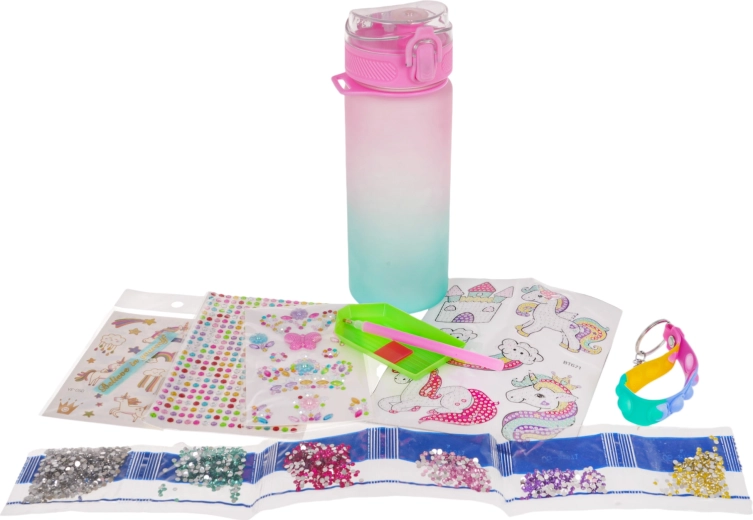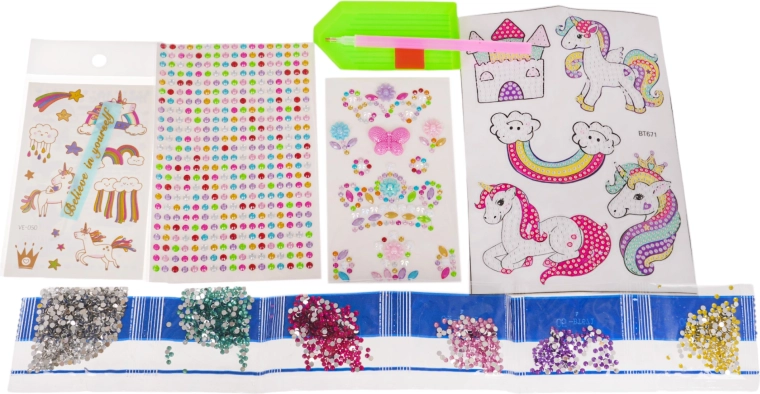 - fles, koord, pen voor steentjes, kunststof schaaltje, kleefkubusje, 6 zakjes met steentjes, stickerblad met eenhoorns, stickerblad met steentjes (408 stuks), stickerblad met bloemcompositie, stickerblad met sjablonen, sticker met opschrift
