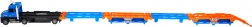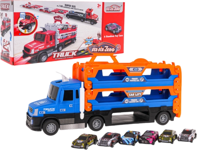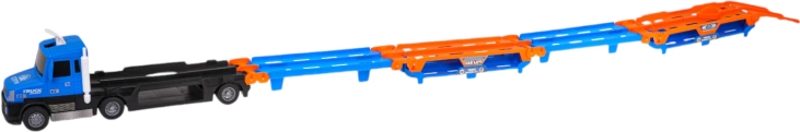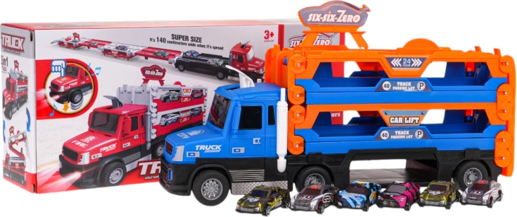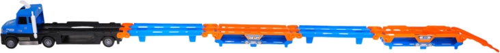 Uitgeklapt creëert de vrachtwagen een tweelaagse baan van tot wel 140 cm, ideaal voor races met de meegeleverde autootjes.