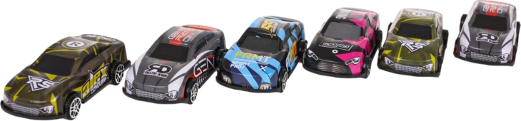 De set bevat zes gedetailleerde voertuigen met metalen carrosserie en aerodynamisch design, klaar voor de race.