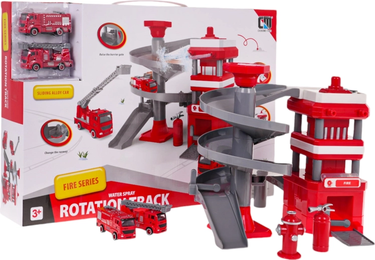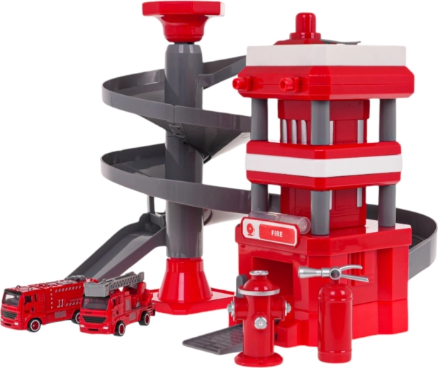 De brandweerkazerne met een meerlagige spiraalvormige helling stelt brandweerwagens in staat naar beneden te rijden en zo de motorische vaardigheden van kinderen te ontwikkelen.