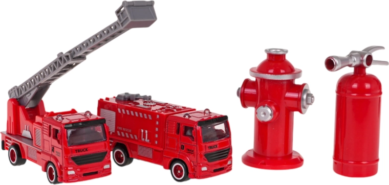 De set bevat twee metalen brandweerwagens, waarvan één een functionele ladder heeft die omhoog gaat, naar beneden gaat en verlengd wordt. Verder bevat de set een brandkraan en brandblusser, waardoor realistische speelscenario's worden ondersteund.