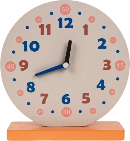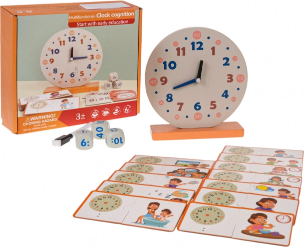 De educatieve set Klok met accessoires is ontworpen zodat kinderen het begrip tijd gemakkelijk kunnen begrijpen. De set bevat een grote houten klok met beweegbare wijzers, drie dobbelstenen met verschillende tijdsaanduidingen en 24 dubbelzijdige puzzelstukjes. Kinderen kunnen leren klokkijken, hun geheugen en concentratie trainen — allemaal in spelvorm.