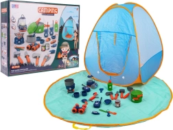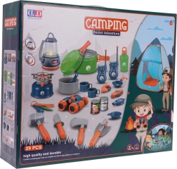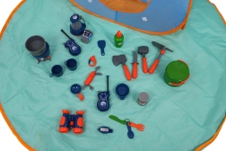 Met 29 onderdelen bevat de set alles wat nodig is voor leuk kampeerspel, waaronder een kooktoestel, lamp en servies.