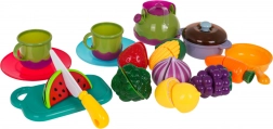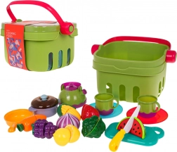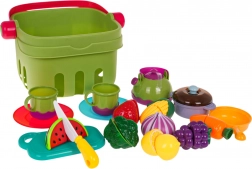 Bevat een mand met deksel, snijplank, messen, potten, pannen, kopjes en andere keukengerei voor realistisch spel.