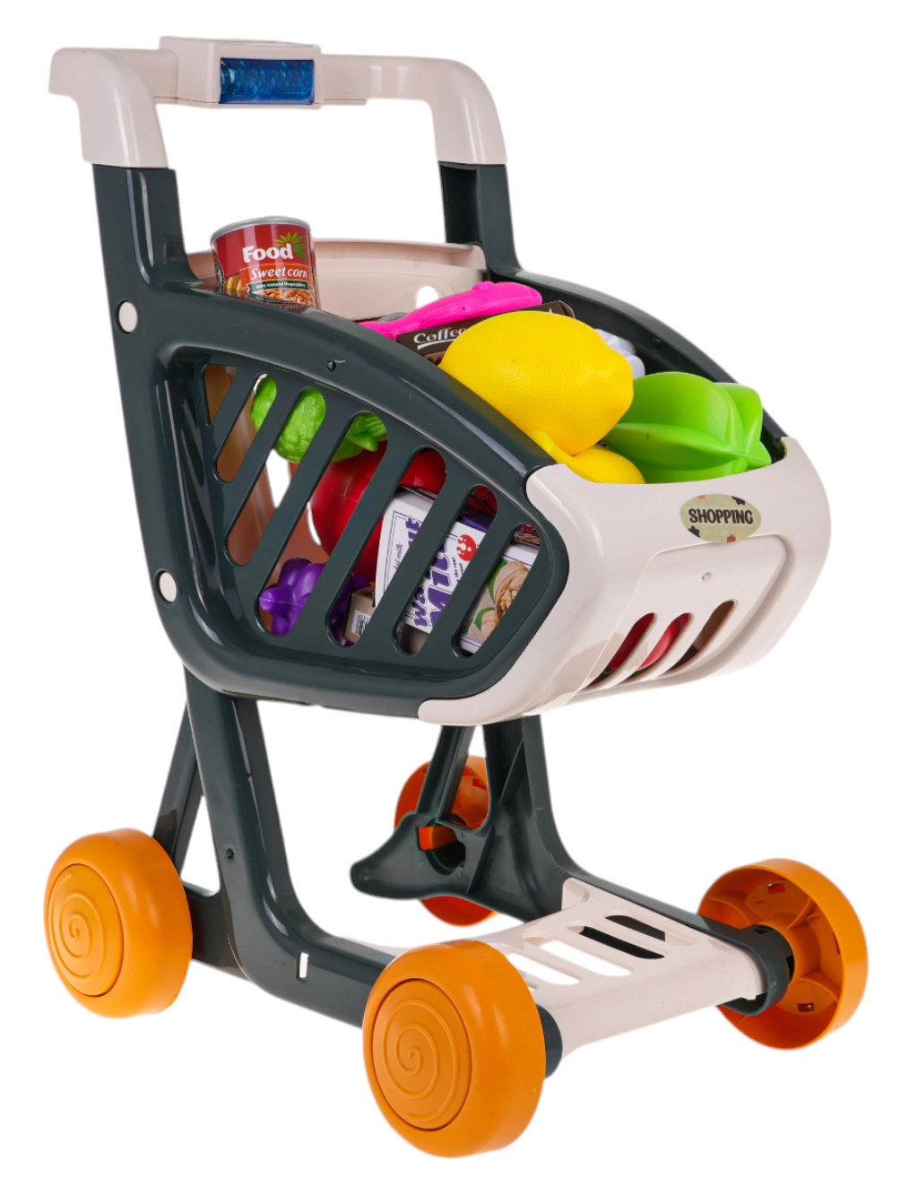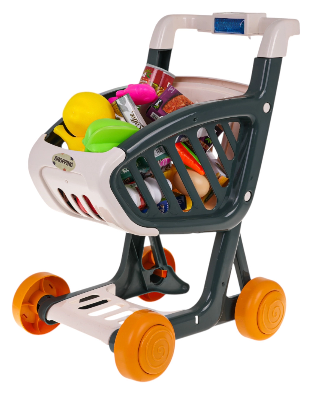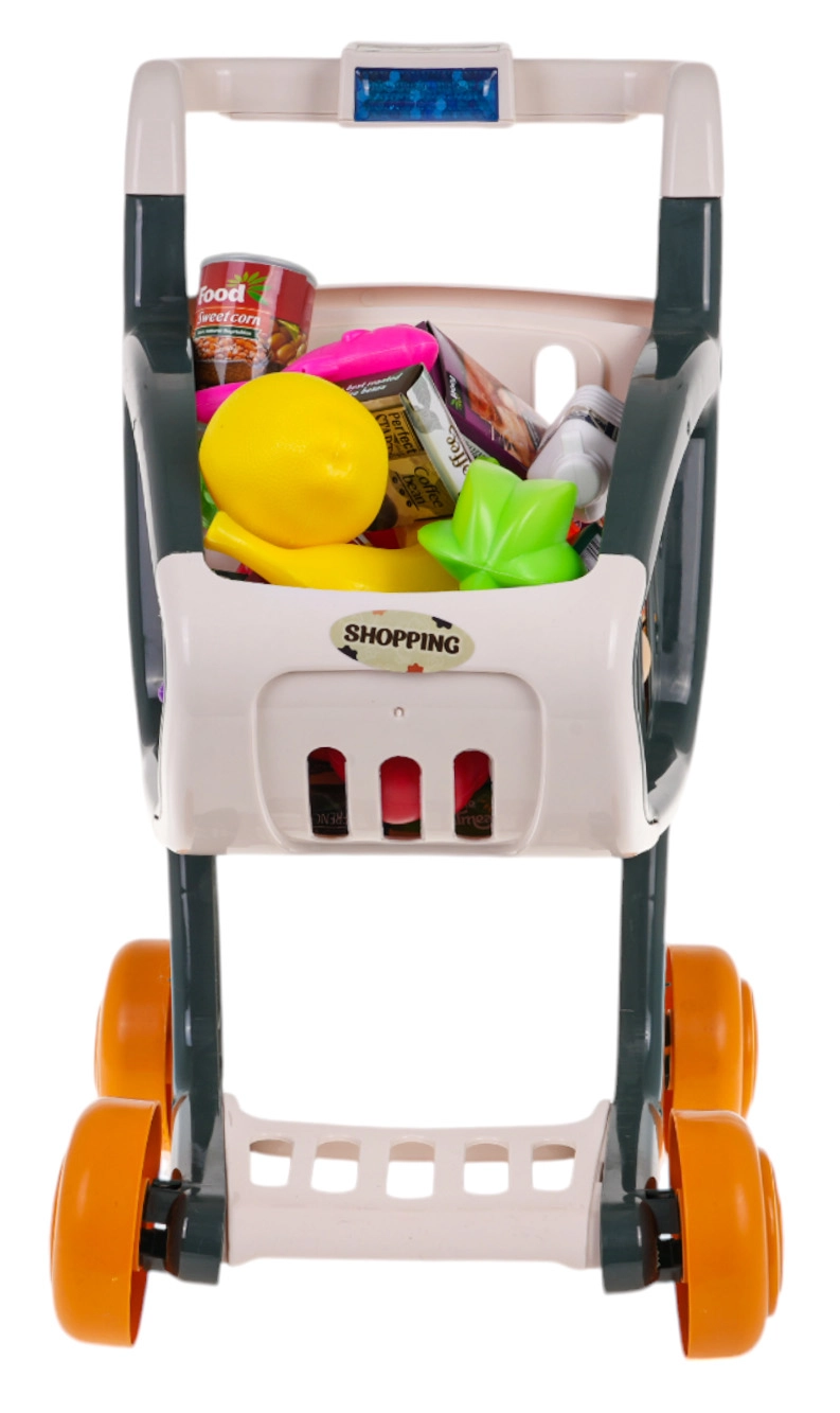 Interactieve winkelwagen voor kinderen vanaf 3 jaar biedt veel plezier en leert tegelijk. Heeft een stabiele constructie, zwenkwielen en een bedieningspaneel met licht en muziek. Na het indrukken van de blauwe knop gaan knipperende LED-lampjes (groen, rood, blauw) branden en klinken vrolijke liedjes. Inclusief 41 accessoires voor realistisch winkelspeelplezier. Batterijen 3× AG13 zijn meegeleverd.