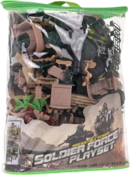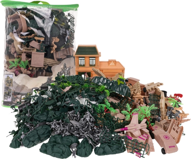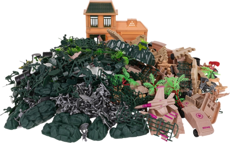Deze rijk uitgeruste set verandert elke kamer in een fantasierijke gevechtszone. Kinderen vinden er tanks, gepantserde wagens, terreinvoertuigen, vliegtuigen, boten, een basis, muren, zandzakken, prikkeldraad en vaten – alles voor realistische legermissies. De figuurtjes zijn in drie kleuren en twee groottes, zodat teams en rollen makkelijk te onderscheiden zijn.