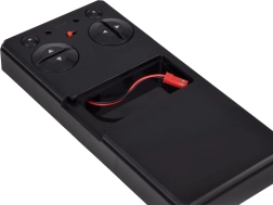 De bediening is intuïtief – met de sticks op de controller bepaal je eenvoudig vooruit/achteruit en met de onderste trimstrip kun je de rechte koers fijn afstellen. Opladen gebeurt rechtstreeks via de controller, zodat je alles bij de hand hebt.