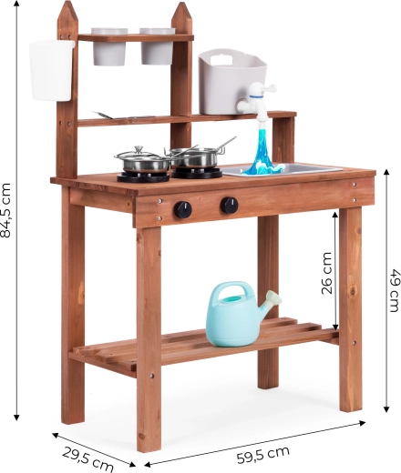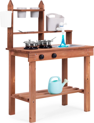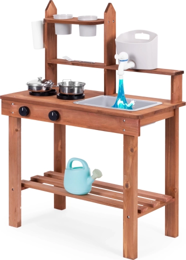 Deze robuuste modderkeuken brengt realistisch koken naar de kinderwereld. Dankzij het reservoir met een werkende kraan hebben kleine koks echt water tot hun beschikking, twee kookpitten met draaiknoppen en uitgebreid metalen accessoires. Het natuurlijke sparrenhout is bestand tegen spel in de tuin, op het terras en ook in de kinderkamer.