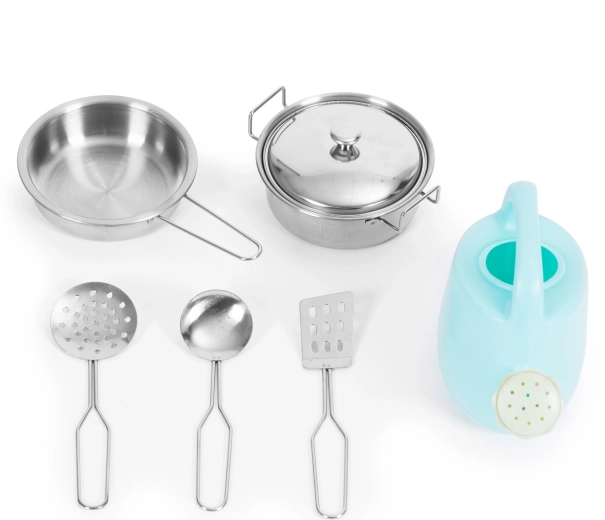 - Rijke set accessoires – pan met deksel, koekenpan, spatels, soeplepel en gieter.