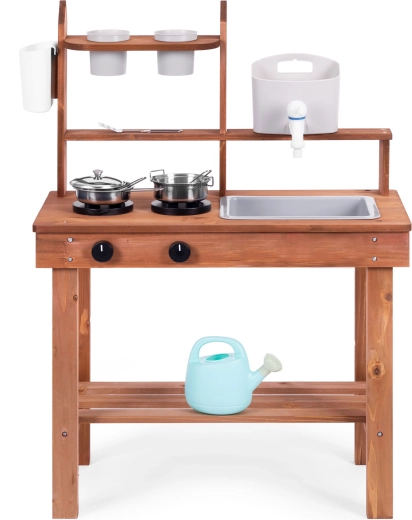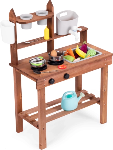 Stimuleert rollenspel en laat kinderen “koken” met zand, aarde of steentjes. Overzichtelijke plankjes en haakjes houden het servies bij de hand, terwijl de compacte afmetingen het plaatsen in kleinere ruimtes vergemakkelijken.