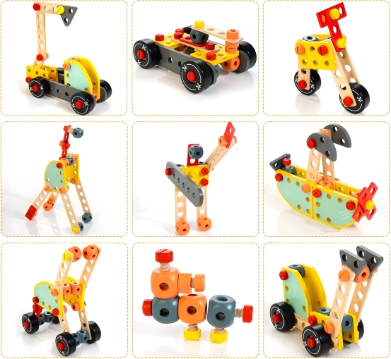 In de doos zit een uitgebreide set houten onderdelen: hamer, zaag, schroevendraaier, sleutel, liniaal, winkelhaak, schroeven, moeren en verbindingsstukken. Daarmee bouwen kinderen tot 9 verschillende modellen (bijv. robot, fiets, boot) of verzinnen ze eigen creaties.