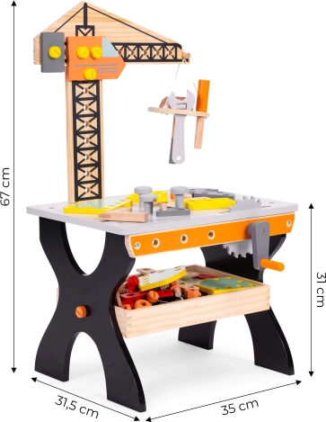 Deze houten werkplaats combineert plezier en ontwikkeling in één set. Kinderen proberen de basis van klussen uit – hameren en spijkers trekken, schroeven, meten en “zagen” – en dat alles veilig dankzij afgeronde randen en stevige materialen. De stabiele constructie, het afleg schap en de gereedschapshaak stimuleren orde en zelfstandigheid.