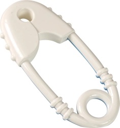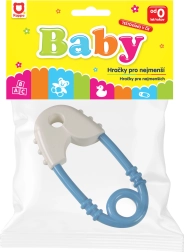 Babyrammel in de stijl van een blauw-witte veiligheidsspeld is ontworpen zodat het gemakkelijk vast te pakken is door kleine kinderhandjes, wat de grijpreflex van het kind stimuleert. Het is veilig, kleurvast en zonder scherpe randen.
