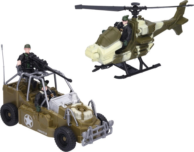 - Auto, helikopter, motor, 5 soldatenfiguren, wapens en accessoires