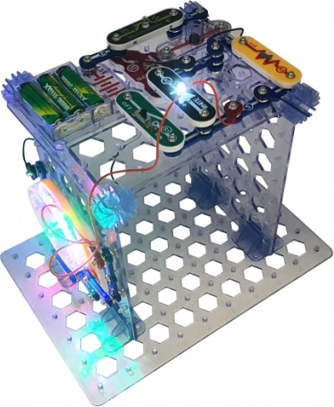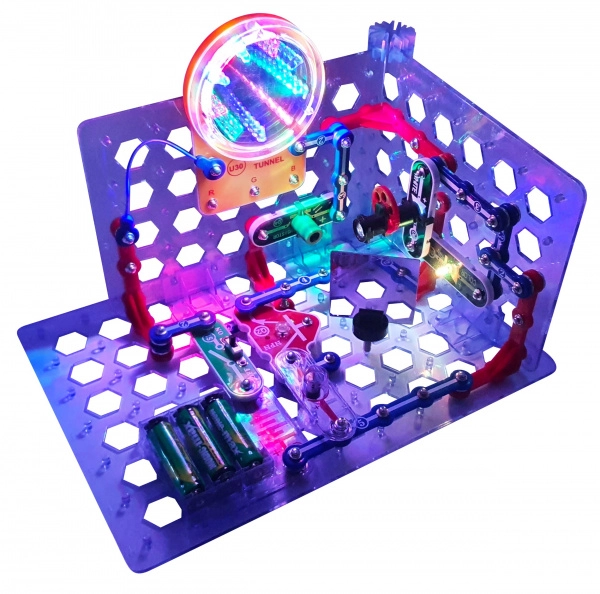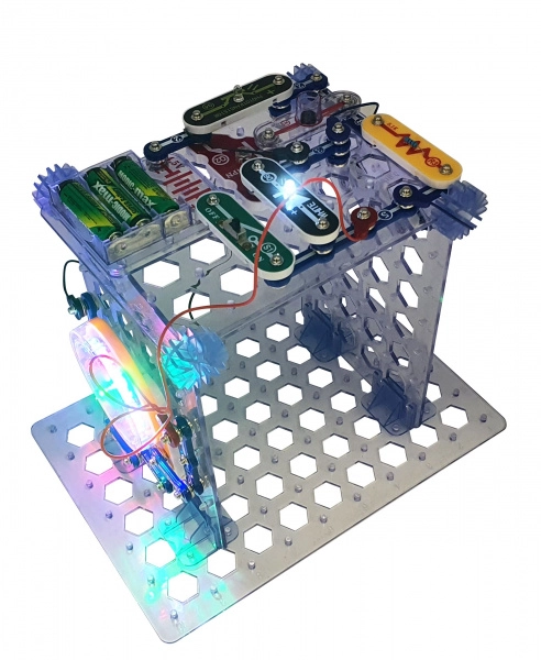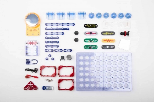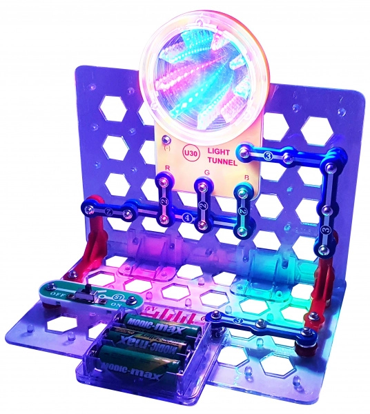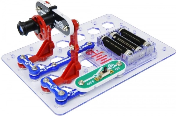 Alle onderdelen klik je eenvoudig vast op het transparante raster. De bouw is snel, overzichtelijk en ideaal voor de eerste stappen in elektronica.