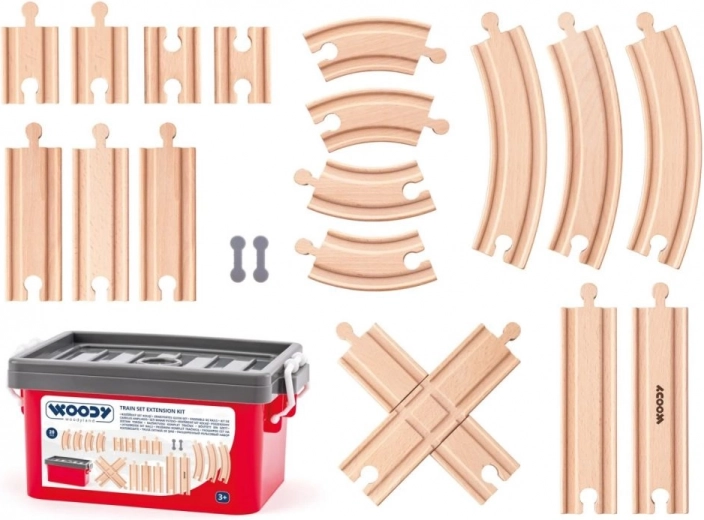 Praktische set met 20 houten railstukken voor treinbanen, opgeborgen in een stevige kunststof box voor gemakkelijk opbergen. Ideale uitbreiding voor kindertreinen, geschikt vanaf 3 jaar en met CE-conformiteit.