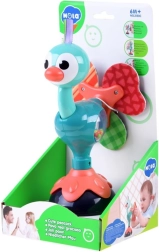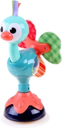De schattige pauw combineert gladde kunststof onderdelen met zachte textiele elementen op de staart om je baby diverse texturen en prikkels te bieden. Nadat het met de zuignap is bevestigd, draait het speeltje om zijn as en maakt het bij beweging zachte rammelende geluiden die kinderen motiveren om te grijpen en te ontdekken.