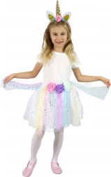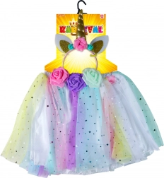Verander je kind in een magische eenhoorn met dit kleurrijke kostuum, bestaande uit een tutu-rokje en een eenhoorn-haarband. Deze set is ideaal voor kinderen die willen genieten van sprookjesachtige avonturen tijdens het spelen. De rok is versierd met gekleurde tule met sterrendecor en is dankzij de elastische taille gemakkelijk aan te passen.