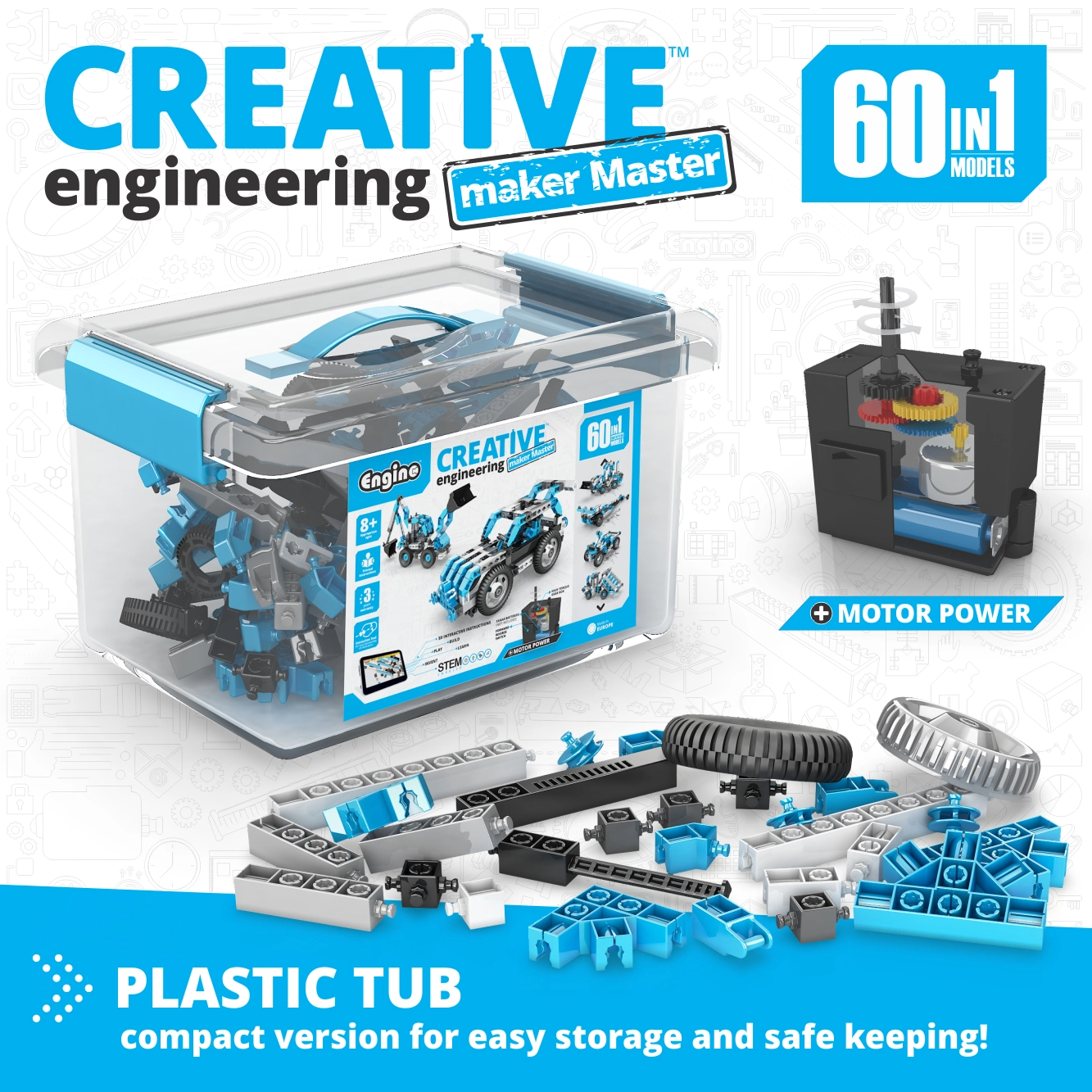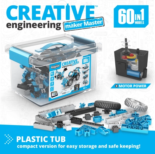 Ontdek de creatieve bouwset ENGINO Motorized Maker 60 in 1, die logisch denken, ruimtelijk inzicht en STEM-vaardigheden ontwikkelt. Van de 223 onderdelen (in de verpakking wordt ook 189 onderdelen voor projecten vermeld) bouw je tot wel 60 technische modellen – van een Formule 1 tot een graafmachine of ruimteschip – en dankzij de motor met tandwieloverbrenging komen ze bovendien in beweging.