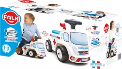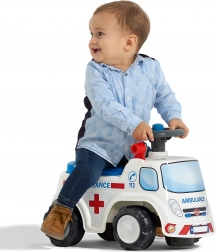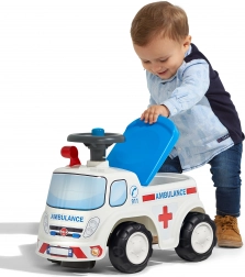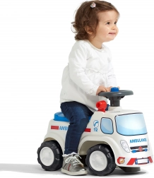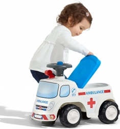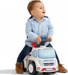 De stijlvolle loopauto in de vorm van een ambulance stimuleert de kinderfantasie en de ontwikkeling van het evenwicht. Dankzij het stuur met claxon leren kinderen hun bewegingen beter te coördineren, terwijl de brede wielen en de stabiele constructie zekerheid bieden bij de eerste ritjes.