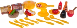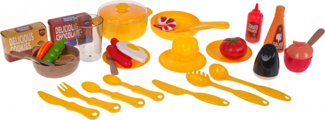 - koekenpan, pan met deksel, kom, bakje met deksel, bekertje, 3 × bord, spatel, soeplepel, mes, vork, lepel, kinderbestek, keukenhulpen, ketchup, dressing, zoutvaatje, koekjesdoosjes, speelvoedsel (paprika, tomaat, erwtjes, sla, wortel, garnaal, ei, worstjes, vis)