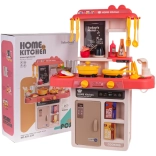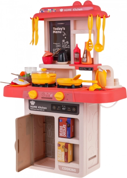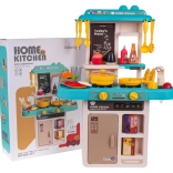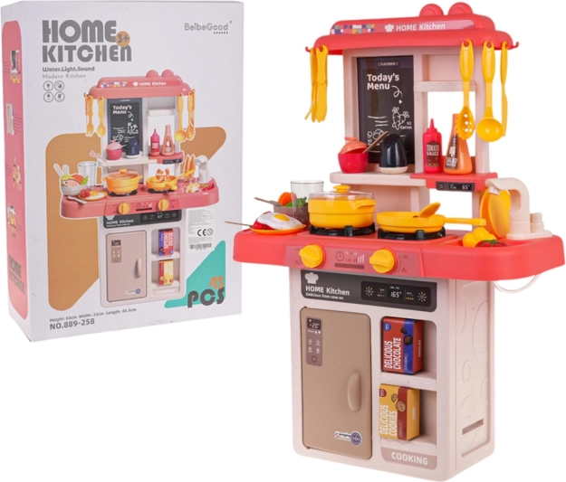Deze interactieve keuken in levendige kleuren zal elk kind enthousiast maken. Dankzij de verlichte kookpitten en realistische kook- en bakgeluiden is het spel maximaal boeiend. De werkende kraan met water maakt afspoelen van vaat mogelijk zoals in een echte keuken, terwijl de “koelkast” met plankjes geopend kan worden voor het opbergen van voedsel.