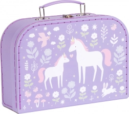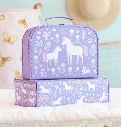 De set van twee decoratieve koffertjes van A Little Lovely Company brengt een speels design met eenhoorns, regenbogen en bloemen op een paarse achtergrond. De lichte maar stevige constructie van duurzaam karton met kwaliteitsstiksel garandeert een lange levensduur en comfortabel dragen.