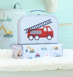 Stijlvolle set van twee koffertjes van duurzaam karton met voertuigen-motief, ideaal voor het opbergen van speelgoed, kleinspullen en knutselmaterialen. Elk koffertje heeft een metalen handvat en een betrouwbare sluiting voor veilig afsluiten.