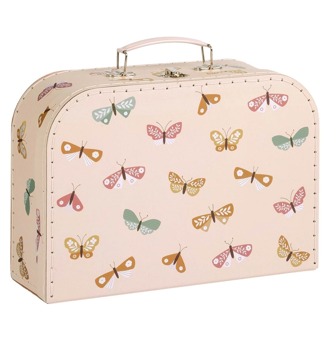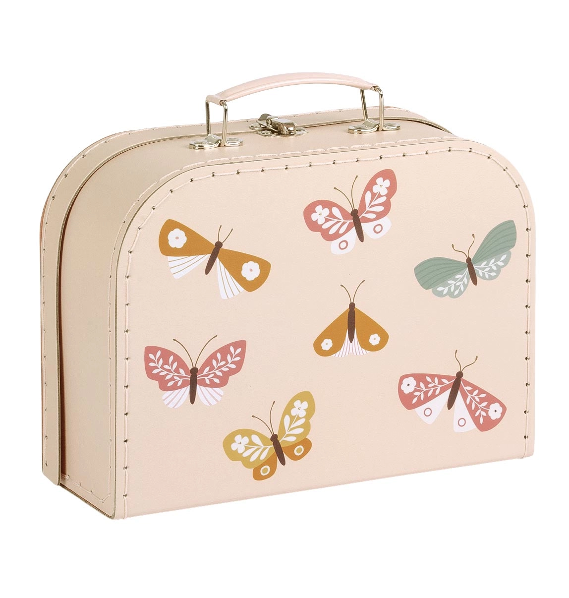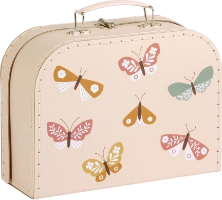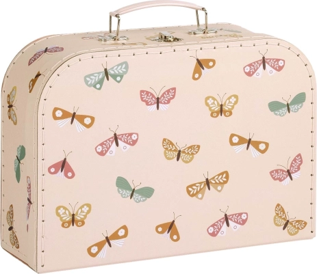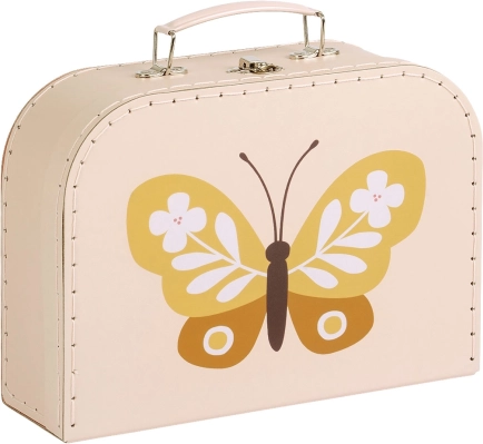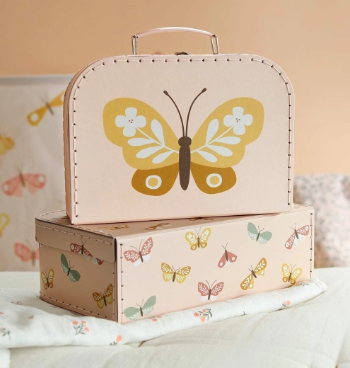 Een praktische en stijlvolle set van twee koffertjes in een zachte beige tint met kleurrijke vlinderillustraties brengt orde én vrolijkheid in het dagelijks gebruik. Het grotere en kleinere koffertje zijn perfect voor speelgoed, potloden, schriftjes, kleine schatten of als decoratieve opbergdozen in de kinderkamer.