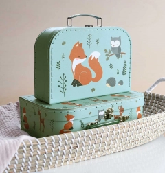 Ontdek een betoverende set van twee koffertjes met illustraties van een vos, uil en andere bosvriendjes. Dankzij de twee formaten orden je eenvoudig speelgoed, potloden en kleine schatten. De stevige kartonnen constructie met kwaliteitsstiksel is bestand tegen dagelijks gebruik, terwijl het metalen handvat en de sluiting zorgen voor comfortabel dragen en veilig afsluiten.