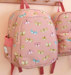 Stijlvolle roze rugzak met vlindermotief van A Little Lovely Company, ideaal voor de kleuterschool en uitstapjes. Beschikt over een ruim hoofdvak, een geïsoleerd voorvak voor snacks, zijvakken voor een fles en gevoerde, verstelbare schouderbanden met borstriem voor veilig en comfortabel dragen.