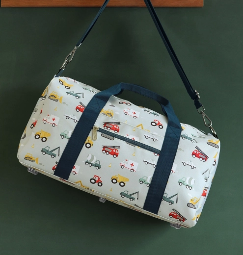 Praktische en ruime kinderreistas van A Little Lovely Company met een motief van voertuigen, ideaal voor clubjes, sport en weekenduitjes. Voorzien van een hoofdvak met binnenvak, twee zijvakken en een voorvak met rits. Licht en duurzaam polyester, handgrepen en een afneembare schouderriem zorgen voor comfortabel dragen. Ook perfect als handbagage in het vliegtuig.