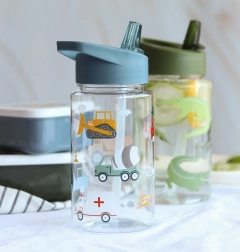Transparante kinderdrinkfles met voertuigen-motief en een praktisch inklapbaar rietje voor comfortabel drinken zonder knoeien. Het sterke materiaal Tritan is licht, veilig en ideaal voor de opvang, school en uitstapjes. Stel een complete set samen in dezelfde stijl – fles, rugzak en broodtrommel.