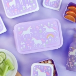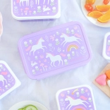 Deze schattige lunchbox van A Little Lovely Company verrast kinderen met een speels design met eenhoorns en een regenboog, en ouders met doordachte details. Dankzij het nauwsluitende deksel blijft de inhoud vers en veilig afgesloten. Het uitneembare dienblad met twee vakken zorgt voor een overzichtelijke indeling van fruit, groenten, brood of lekkernijen.