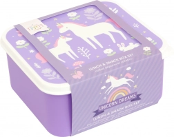 Praktische set van vier broodtrommels in vier formaten met een motief van eenhoorns en regenbogen. De bakjes gaan gemakkelijk open, kunnen in elkaar gestapeld worden om ruimte te besparen en zijn ideaal voor lunch, tussendoortjes en kleine spulletjes voor de opvang of op uitstapjes.