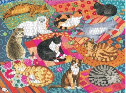 Geniet van ontspanning met de prachtige GALISON-puzzel met een motief van illustratrice Alison Kolesar. Deze puzzel van 1000 stukjes toont schattige katten op kleurrijke dekens en kussens, gemaakt van gerecyclede materialen, met een matte afwerking, niet-giftige inkten en hoogwaardige bedrukking voor levendige kleuren en detail.