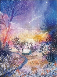 De dromerige illustratie van Laivi Põder brengt de magie van een winternacht met fonkelende sterren, een huisje en herten die zowel het oog als de geest verheugen.