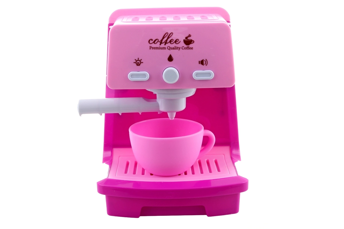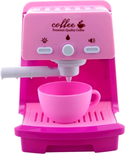 Kinderkoffiezetapparaat met licht- en geluidseffecten, portafilter en kopje. In het reservoir kan water worden gegoten en handmatig worden gepompt – net als bij het echte zetten van espresso.