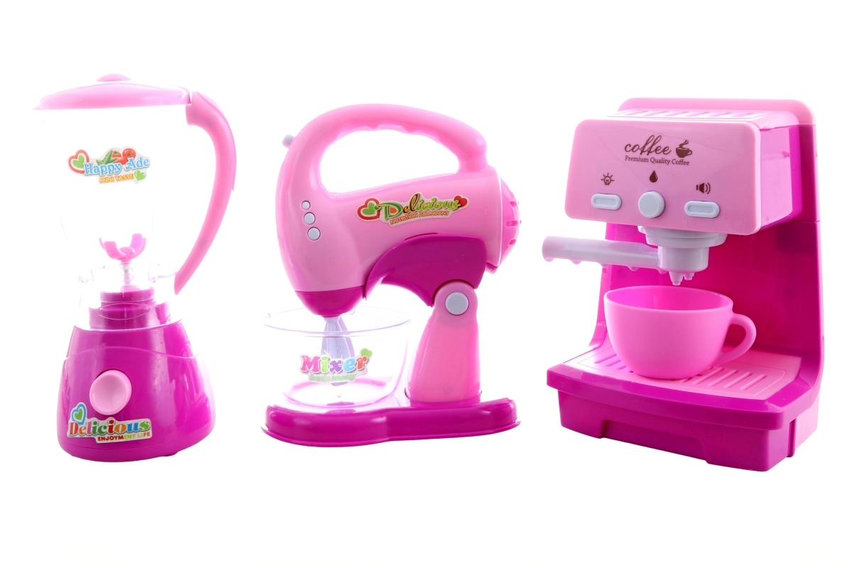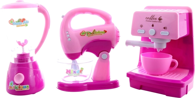 Inbegrepen zijn een koffiezetapparaat met kopje, een blender met transparante kan en een handmixer met kom. Elk apparaat werkt op 2× AA-batterijen (niet inbegrepen). De hele set is verpakt in een geschenkdoos van ca. 43 × 22 × 10 cm.