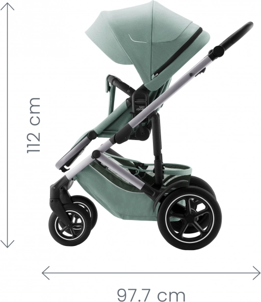 Geveerd frame, grote lekbestendige rubberen wielen en een compacte breedte van 57 cm voor vlot manoeuvreren in de stad en in de natuur. Extra kap met UPF 50+ en een ruime mand met een draagvermogen van 7 kg.
