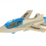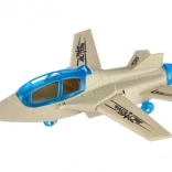 De straaljager heeft een blauwe cockpitkap die open kan en zichtbare bewapening met oranje uiteinden – ideaal voor veilig en creatief spelen.