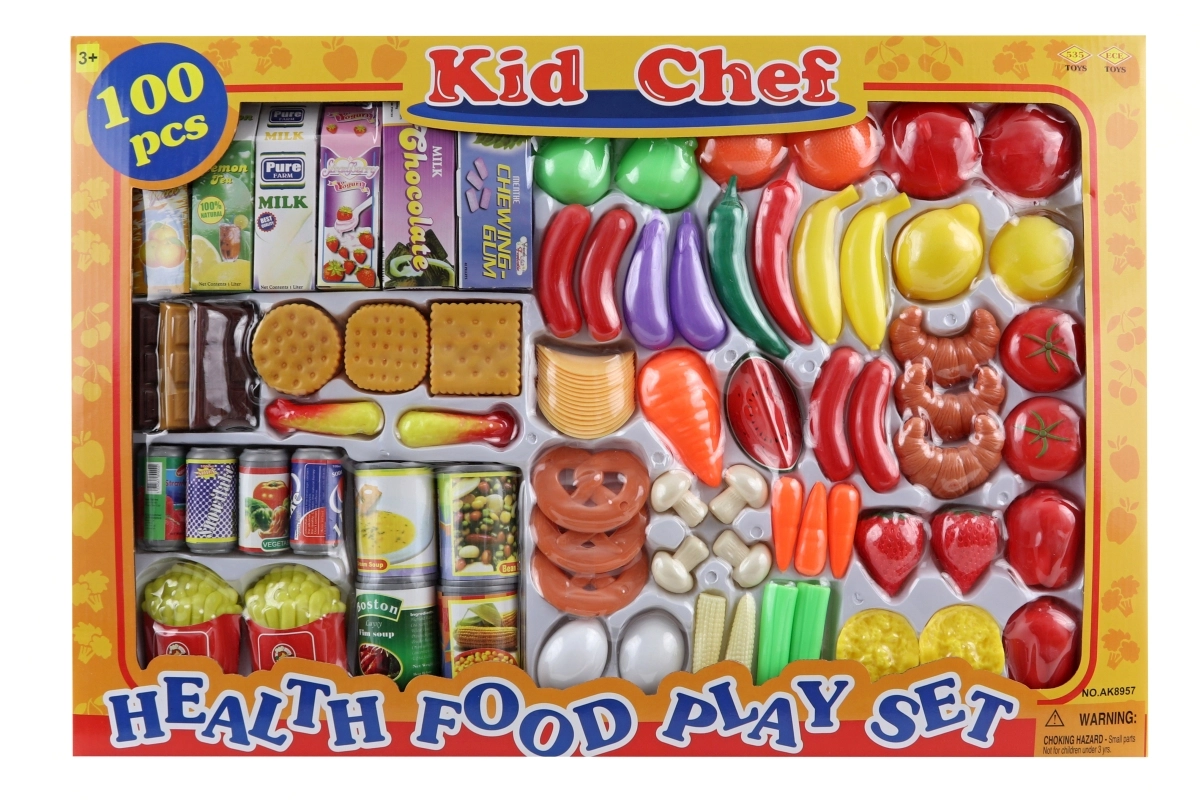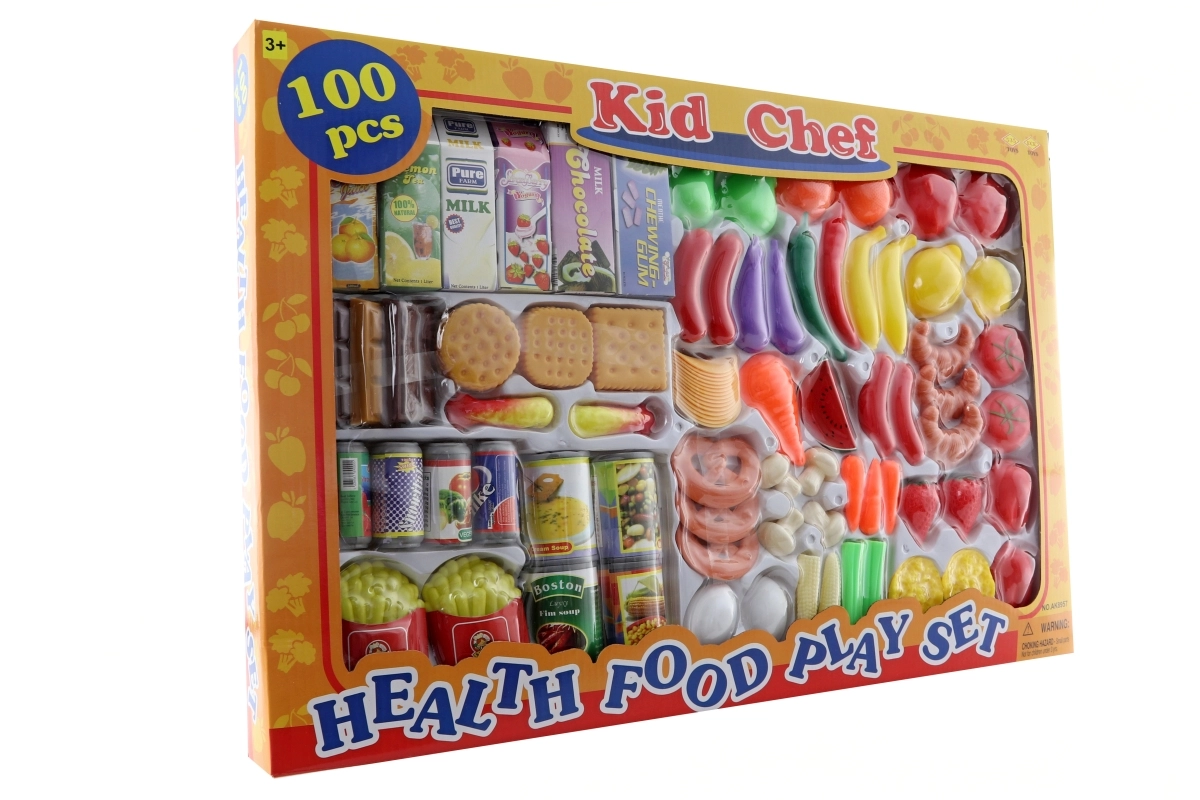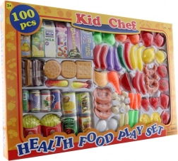 Grote set met etenswaren. De verpakking bevat in totaal 100 stukjes (fruit, groenten, broodwaren, zoetigheden, conserven en drankjes in karton). Afmetingen van de verpakking ca. 58×39×5 cm. Leeftijd 3+