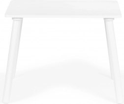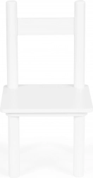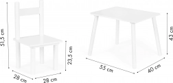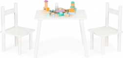 Praktische witte set voor kinderen vanaf 3 jaar: een tafel en twee stoelen met grenen poten en een MDF-blad. Ideaal om te spelen, knutselen en leren. Stabiele constructie, onderhoudsvriendelijk, Scandinavisch design en een groot werkoppervlak voor twee kinderen.