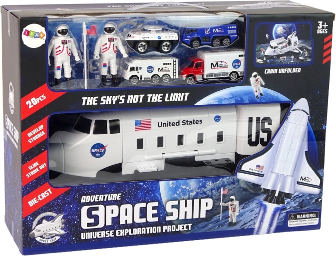 Ontdek een creatief speelpakket voor kleine ontdekkers – een gedetailleerde ruimteraket met opbergruimte voor mini-voertuigen, een openklapbaar dak en een achterste laadklep. Kinderen beleven uren speelplezier met laden, lossen en het verkennen van de ruimte. Inclusief astronauten, verkeersborden en boompjes. Het speelgoed is gemaakt van duurzaam en veilig materiaal, is voorzien van de CE-certificering en stimuleert fantasie en leren over de ruimte.