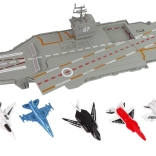 Een enorme speelgoed-vliegdekschip met vijf straaljagers brengt kinderen eindeloze actie en fantasie. Aan boord vind je knoppen die geluids- en lichteffecten activeren, een rood en een hefplatform met handbediening. De royale afmetingen, het militaire ontwerp en de complete set inclusief 2× AG13-batterijen maken het tot een geweldig cadeau voor kleine liefhebbers van de marine.