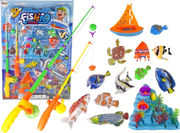 De set bevat twee hengels, 11 visjes en accessoires. De hengels hebben een gemonteerde spoel waarmee de lijn kan worden neergelaten of opgehaald, en aan het uiteinde zit een magneet om de vissen te vangen. Dit vereist van de kleine visser vrij veel precisie.