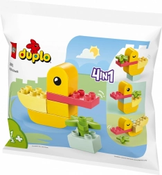 De set DUPLO Mijn eerste eendje 4-in-1 laat kinderen verschillende modellen bouwen en opnieuw samenstellen. Hij bevat vrolijk gekleurde stenen waarmee kinderen verhaaltjes kunnen maken waarin het eendje zwemt, eet en slaapt.
