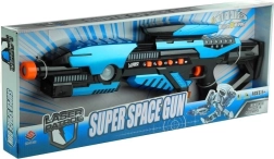 Met dit kosmische pistool zal elke jonge strijder klaar zijn voor ongelooflijke avonturen. Het zwart en turkooizen design gecombineerd met oranje details zorgt voor een moderne uitstraling. Het pistool heeft verschillende knoppen - de eerste voor het activeren van geluid, een andere voor het wijzigen van de kleur van de LED-lichten, waardoor u kunt kiezen uit vijf kleuren: blauw, groen, roze, geel en rood. Andere knoppen veranderen de modus van het wapen en de herlaadgeluiden.
