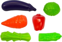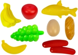 De set bevat verschillende soorten plastic etenswaren die gezonde eetgewoonten illustreren.