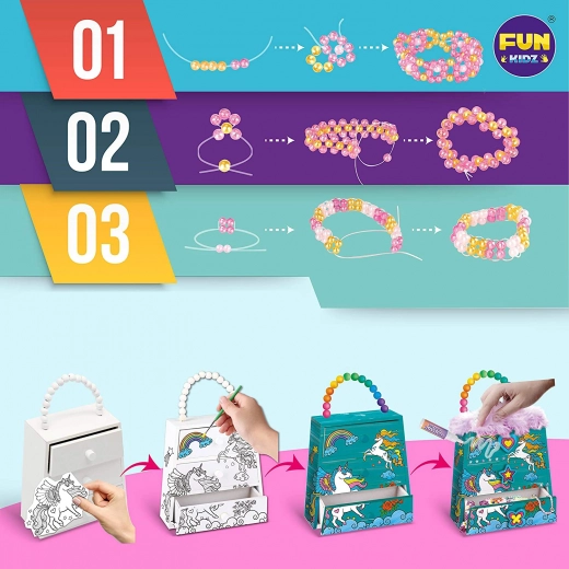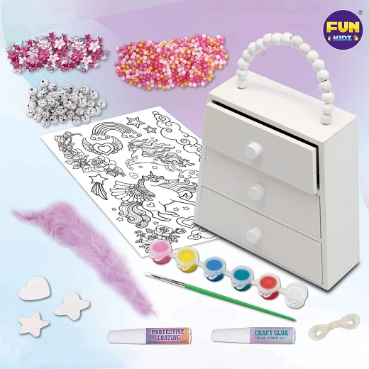 - De set bevat een houten sieradendoosje, penseel, 6 kleuren, touw, lijm en een breed scala aan decoraties.